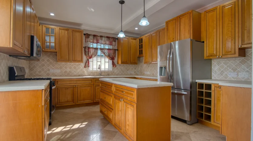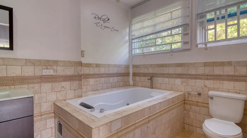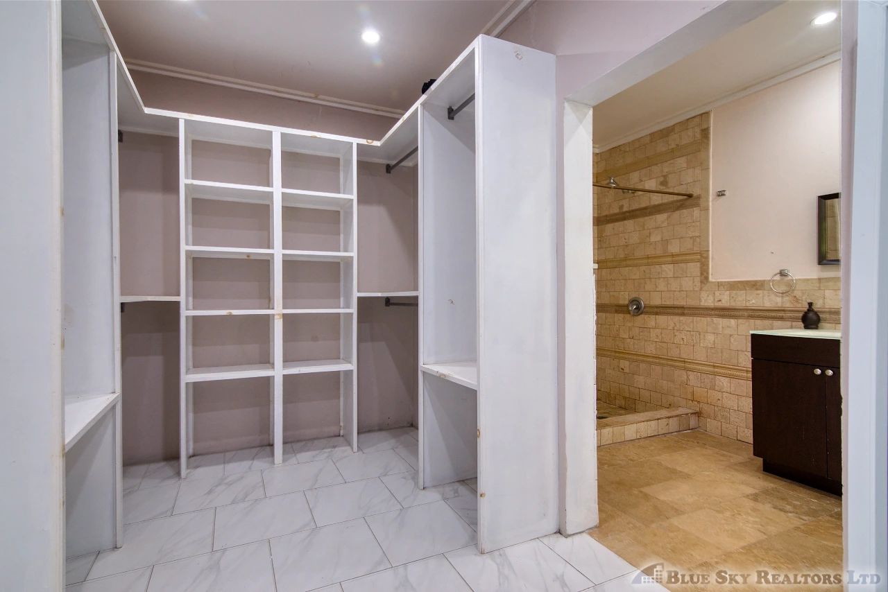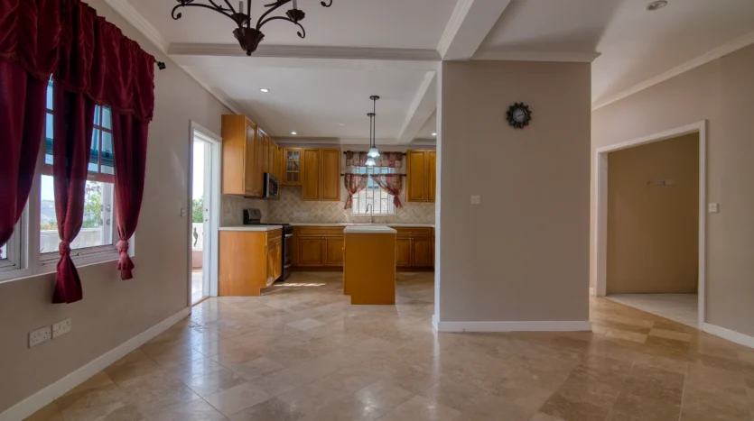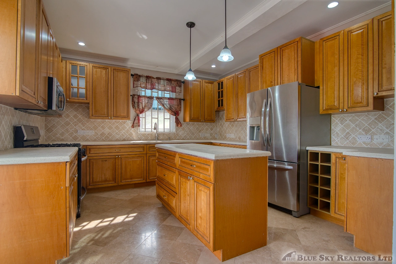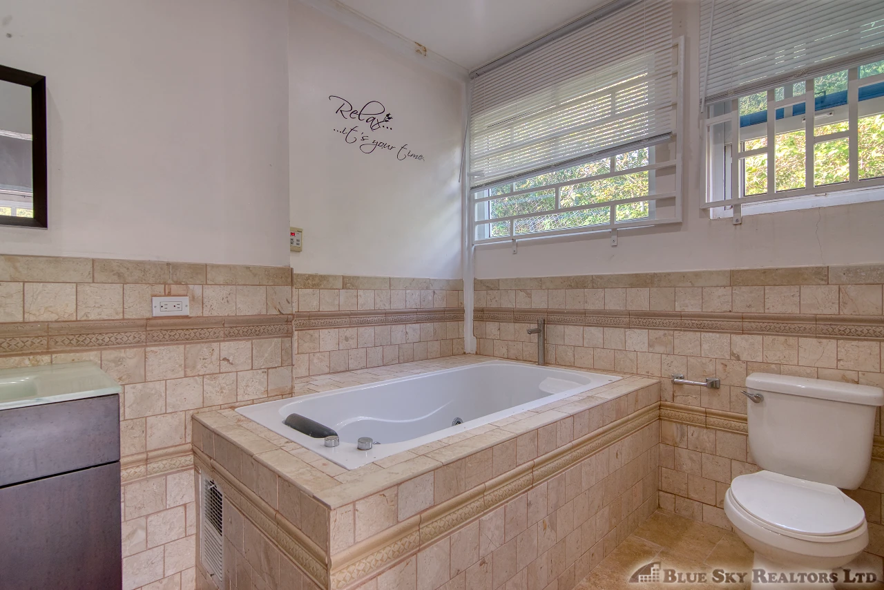 The upper floor of the residence is remarkably spacious, featuring three bedrooms and a modernized aesthetic that is consistent throughout the home. The master bedroom is a true highlight, featuring an ensuite layout with open walk-in closets and a bathroom finished in exquisite travertine tile, complete with a jacuzzi-style bathtub and shower. A private back porch attached to the master suite provides a quiet corner to enjoy the picturesque mountain and sea vistas. The kitchen is equally impressive, boasting a functional island and beautifully crafted timber-finished cabinetry that complements the ceramic tiled floors.