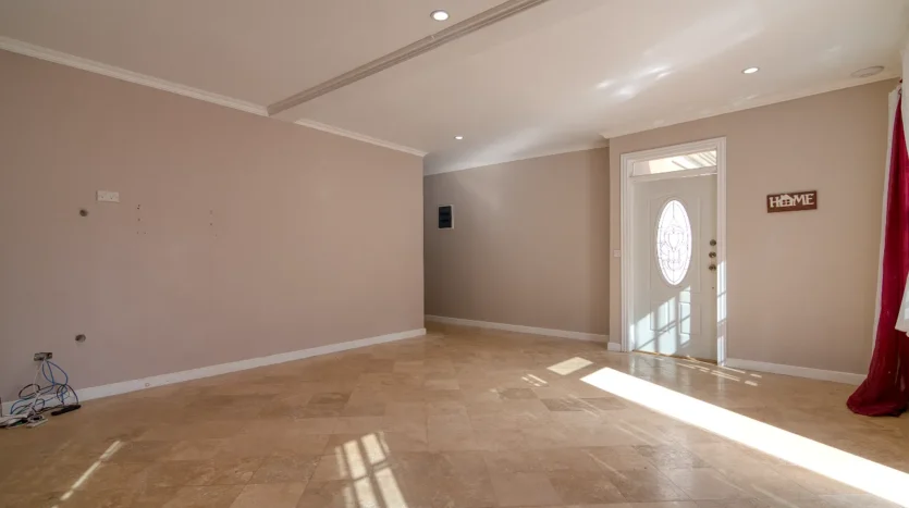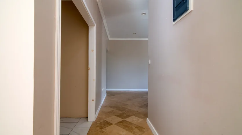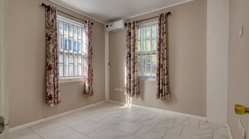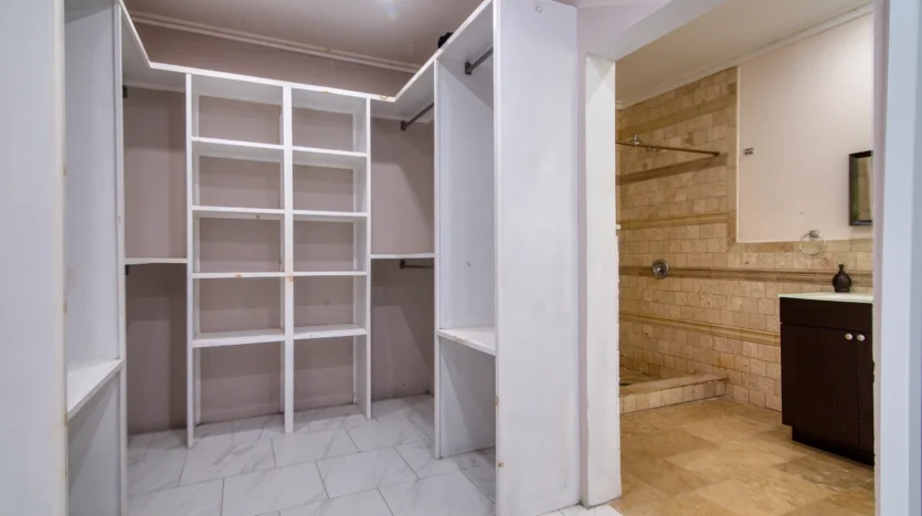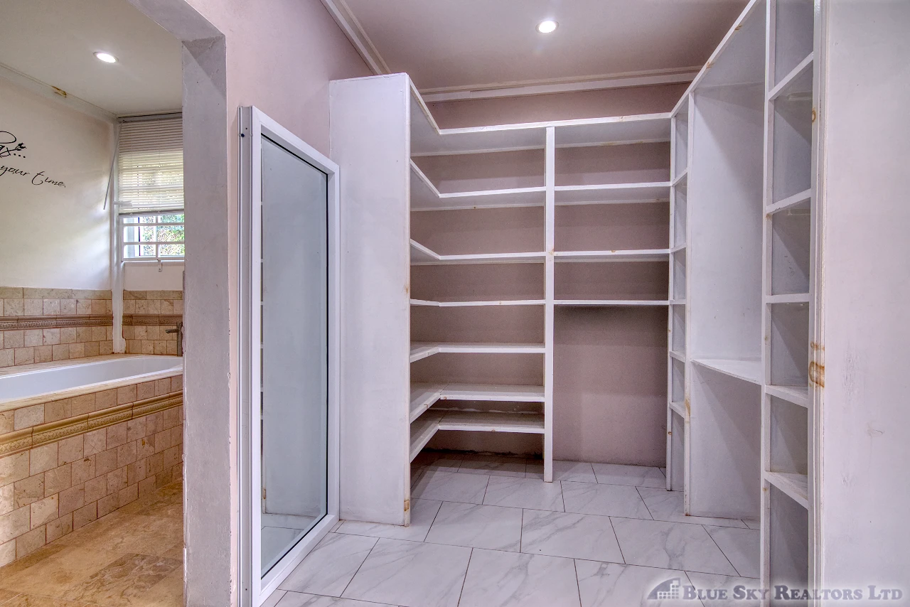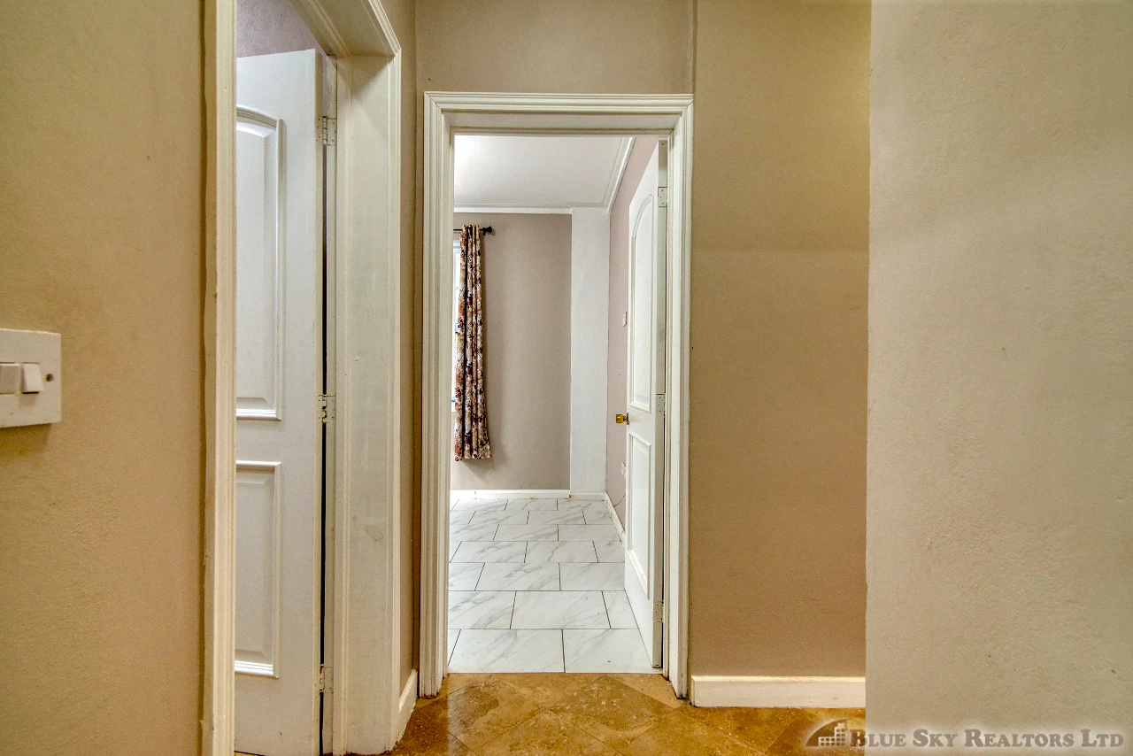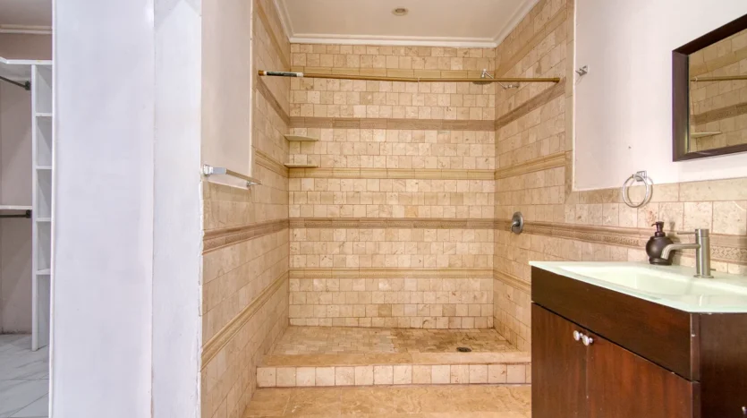 The upper floor of the residence is remarkably spacious, featuring three bedrooms and a modernized aesthetic that is consistent throughout the home. The master bedroom is a true highlight, featuring an ensuite layout with open walk-in closets and a bathroom finished in exquisite travertine tile, complete with a jacuzzi-style bathtub and shower. A private back porch attached to the master suite provides a quiet corner to enjoy the picturesque mountain and sea vistas. The kitchen is equally impressive, boasting a functional island and beautifully crafted timber-finished cabinetry that complements the ceramic tiled floors.