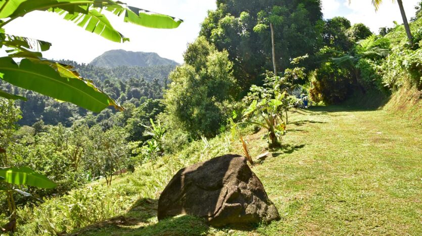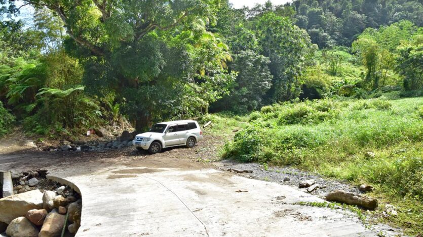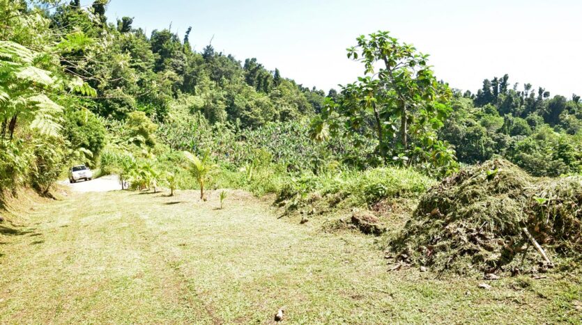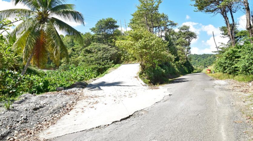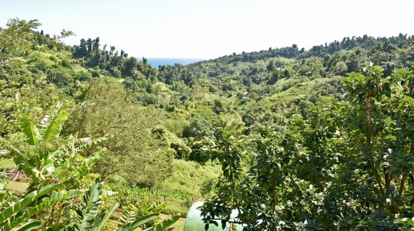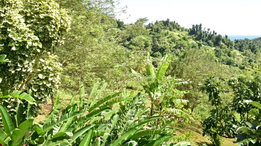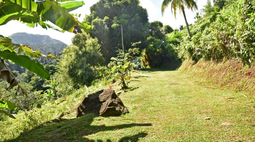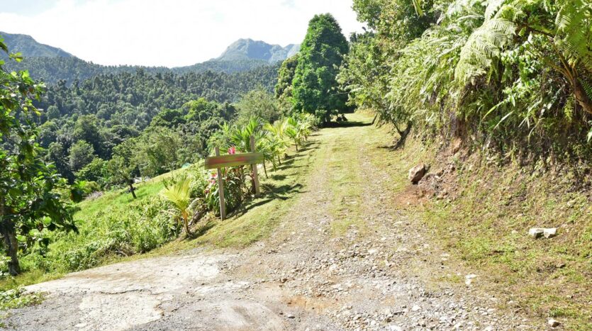 Adored with the clean flowing Canal River and offering breath taking Sea and Mountain views, this well laid out 3.86 acres of mainly gently sloping land and plateaus with about 50% of cultivation is a mere mile eastwards and inland along a partially paved road branching off from the main road to the village of La Plaine immediately before the entrance to the Beach. It bounds with an agricultural feeder road on the east and a paved road on the north leading to the Canal River and properties further afield.