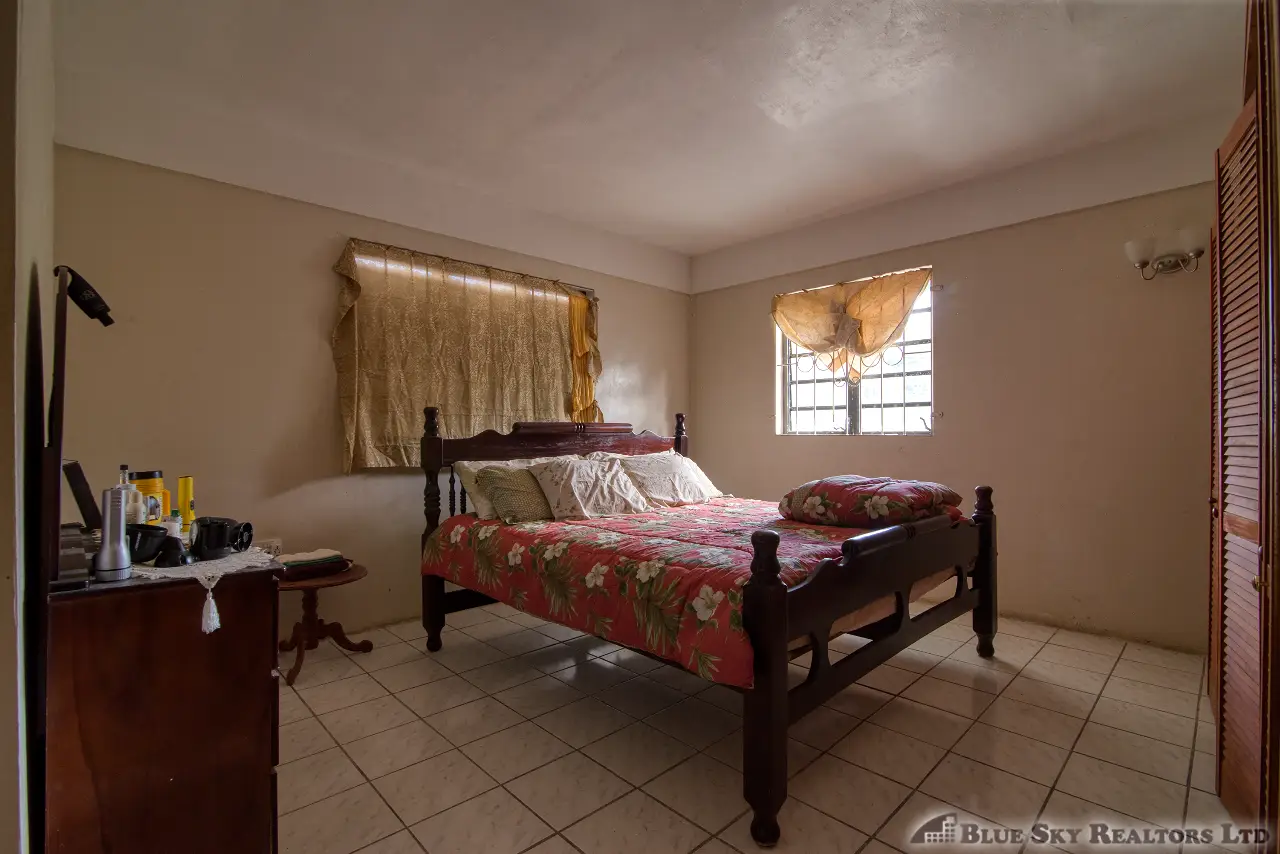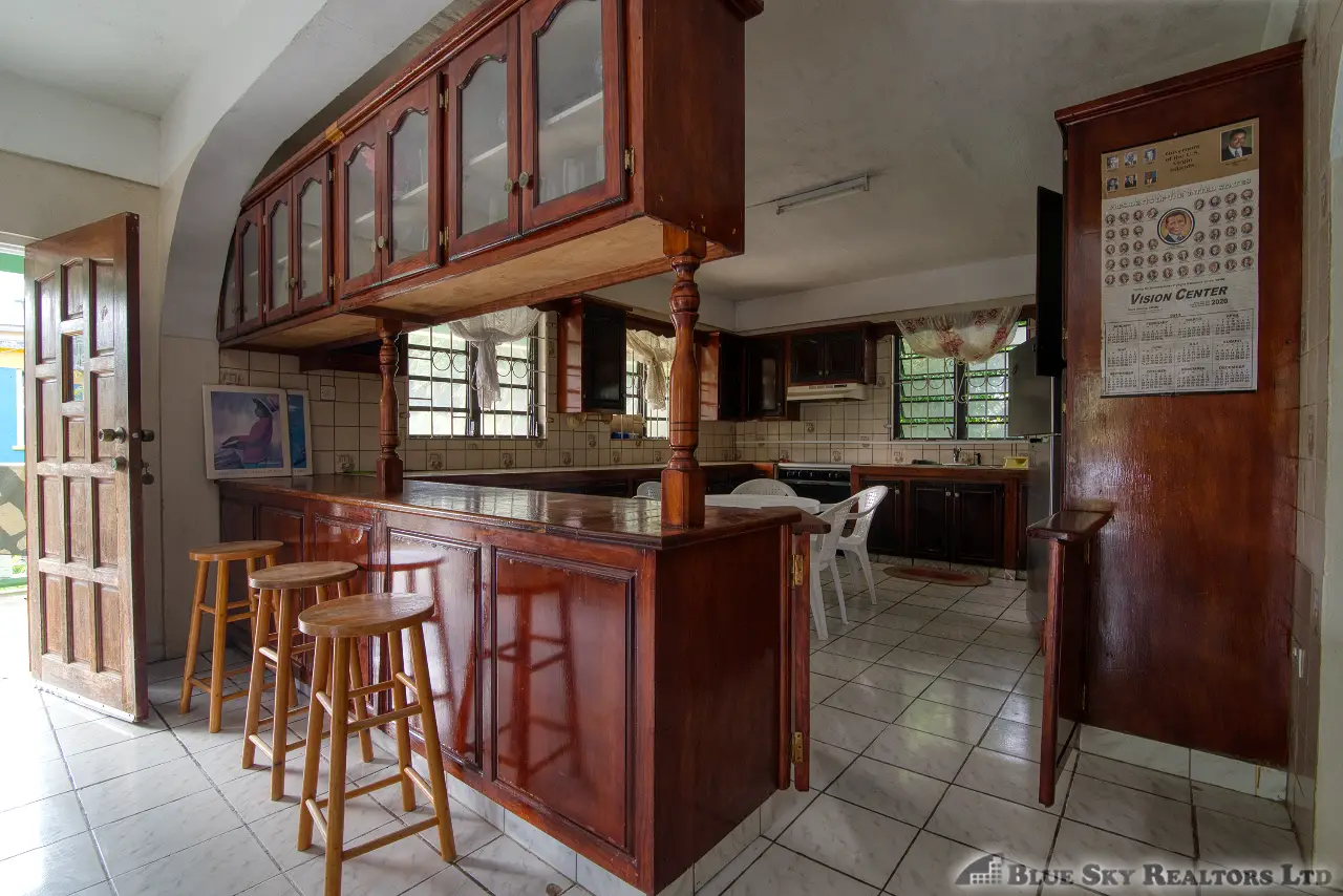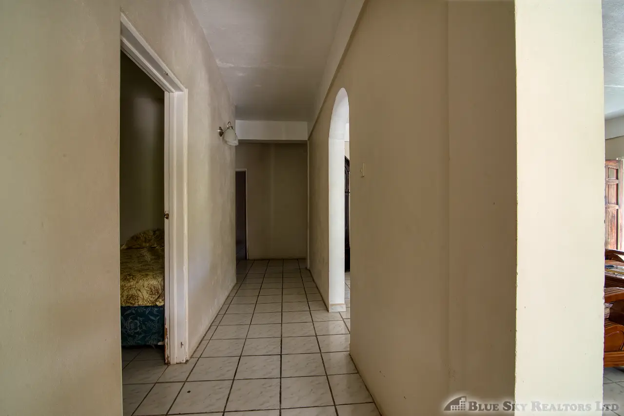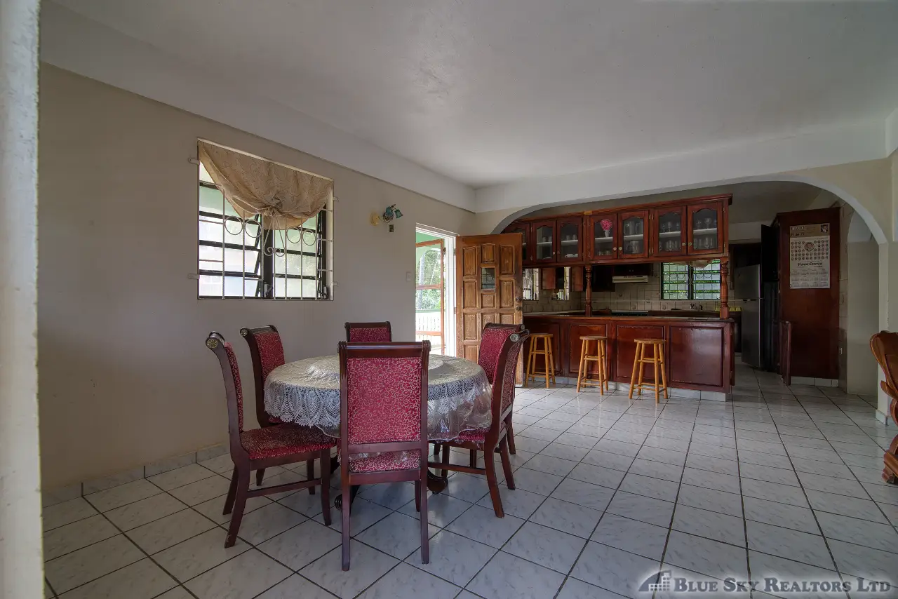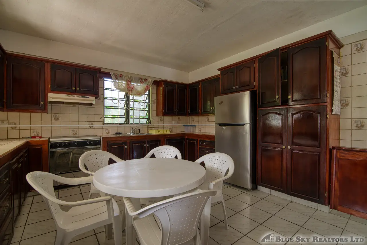 Built in the 1990s, the home is structurally sound and presents a gross floor area of 2,725 square feet. The interior features a practical and large open-plan layout for the living, dining, and kitchen areas, ensuring ease of movement. The kitchen is equipped with built-in wooden cabinetry and concrete tiled countertops. The accommodation includes an ensuite Master bedroom, with a shared bathroom serving the two additional bedrooms. The house features ceramic tile flooring throughout, glass awning windows, and a 190 square foot enclosed garage. Notably, the concrete roof provides durability and clear potential for either a recreation area or future upward expansion.