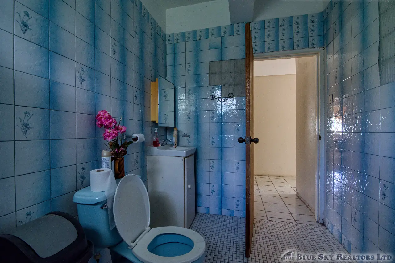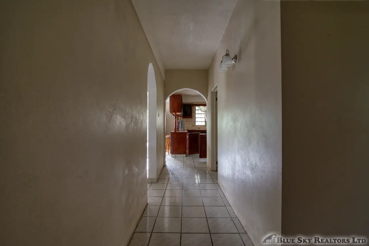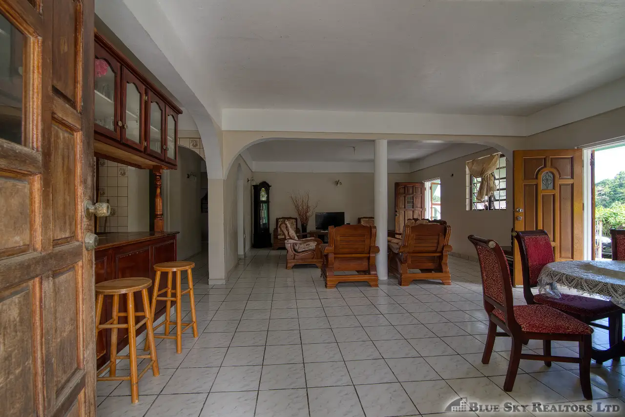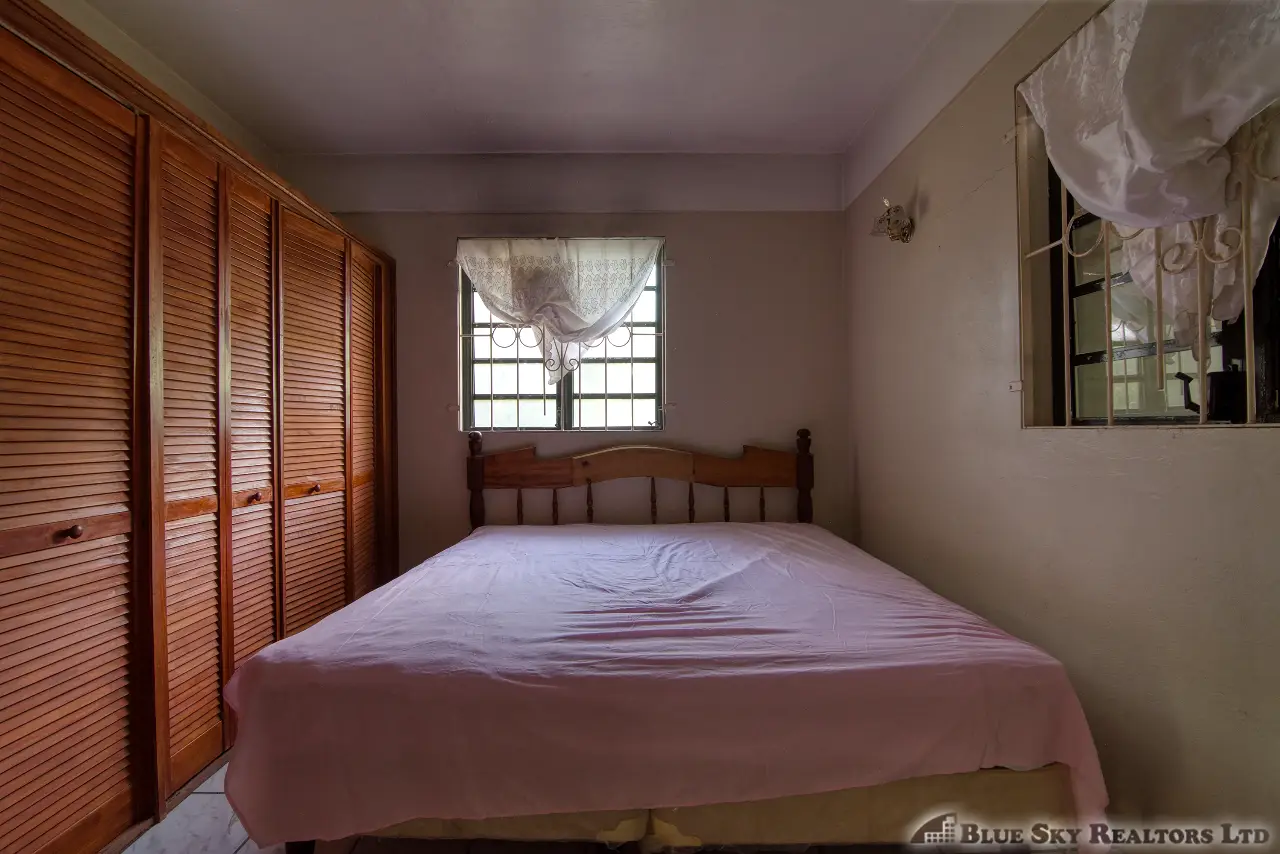 Built in the 1990s, the home is structurally sound and presents a gross floor area of 2,725 square feet. The interior features a practical and large open-plan layout for the living, dining, and kitchen areas, ensuring ease of movement. The kitchen is equipped with built-in wooden cabinetry and concrete tiled countertops. The accommodation includes an ensuite Master bedroom, with a shared bathroom serving the two additional bedrooms. The house features ceramic tile flooring throughout, glass awning windows, and a 190 square foot enclosed garage. Notably, the concrete roof provides durability and clear potential for either a recreation area or future upward expansion.