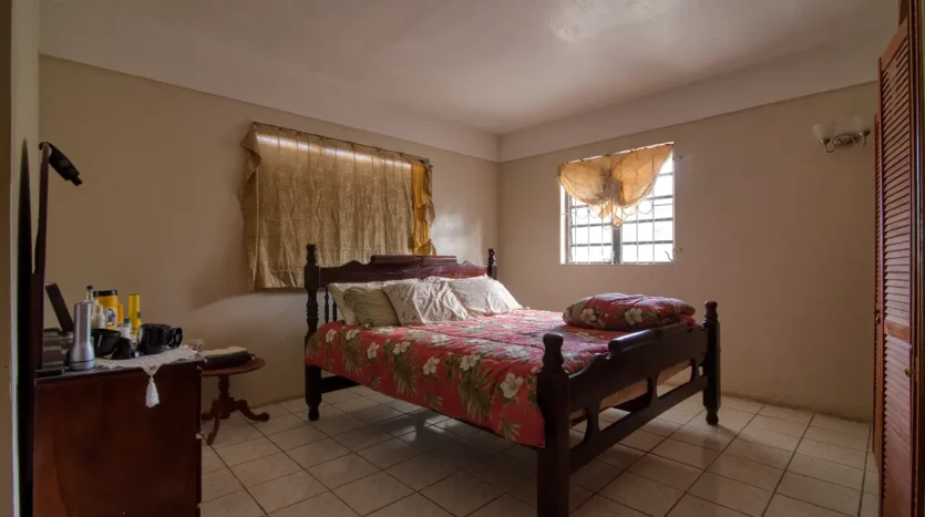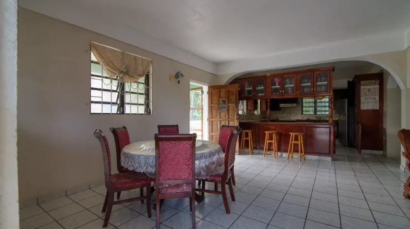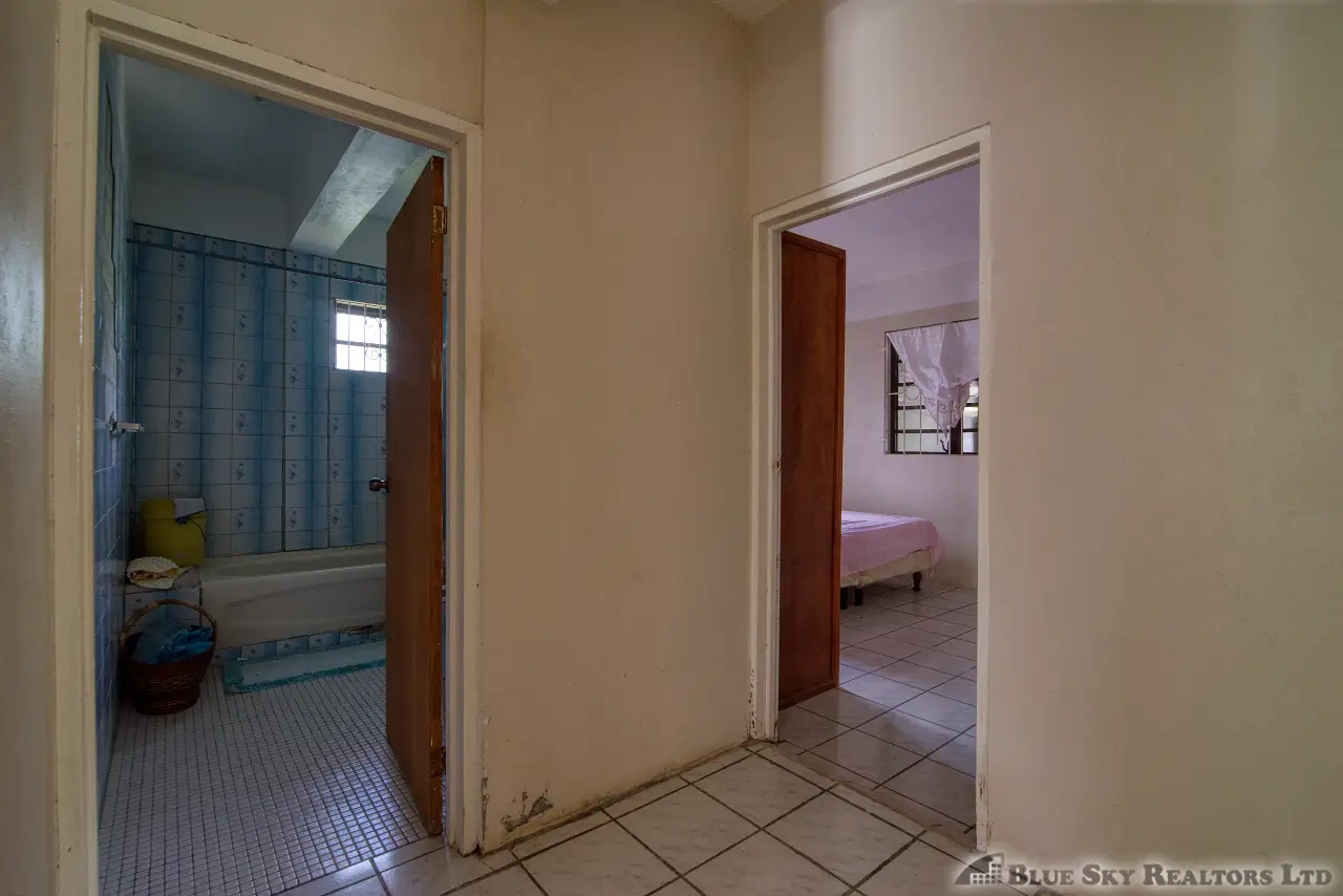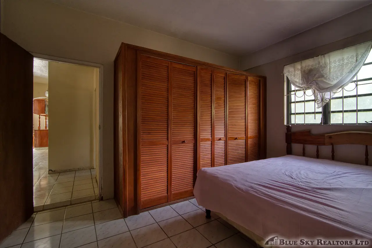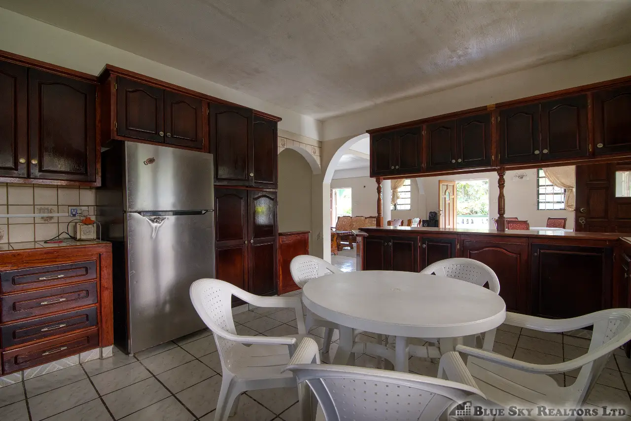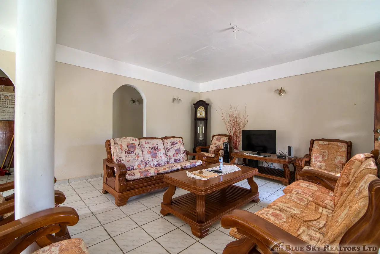 Built in the 1990s, the home is structurally sound and presents a gross floor area of 2,725 square feet. The interior features a practical and large open-plan layout for the living, dining, and kitchen areas, ensuring ease of movement. The kitchen is equipped with built-in wooden cabinetry and concrete tiled countertops. The accommodation includes an ensuite Master bedroom, with a shared bathroom serving the two additional bedrooms. The house features ceramic tile flooring throughout, glass awning windows, and a 190 square foot enclosed garage. Notably, the concrete roof provides durability and clear potential for either a recreation area or future upward expansion.