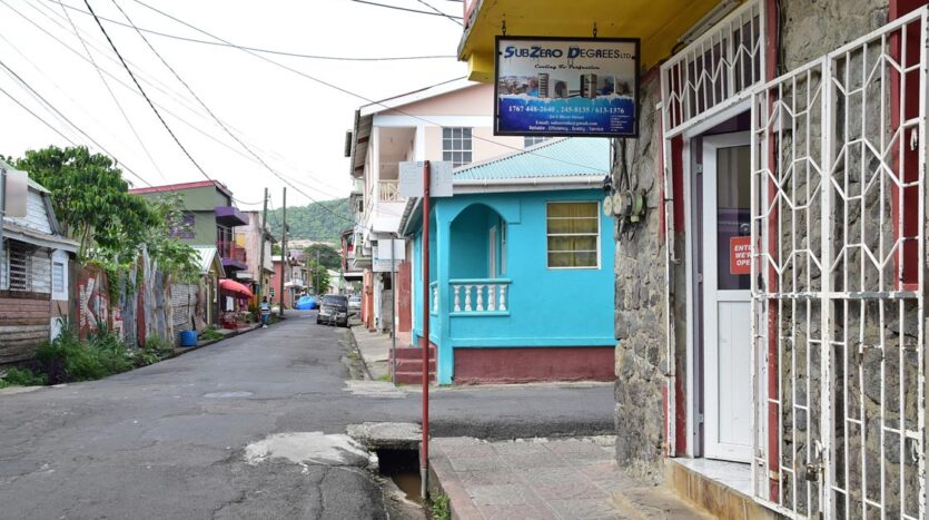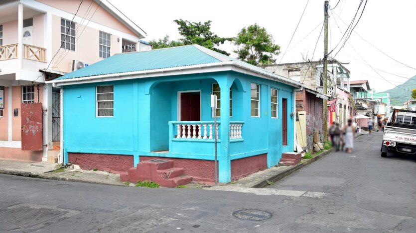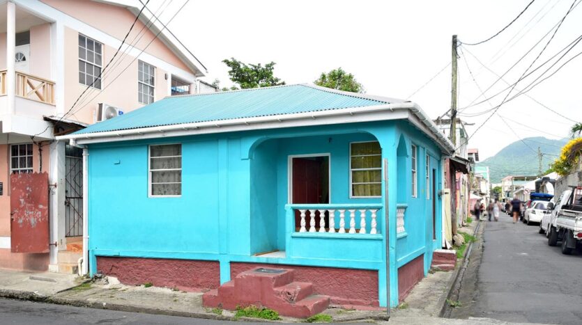 A traditional concrete bungalow well placed on a plot of land containing 569 square feet on the corner of River Street and Upper Lane, a busy hub of the capital City of Roseau.